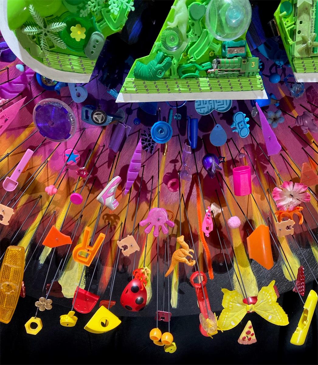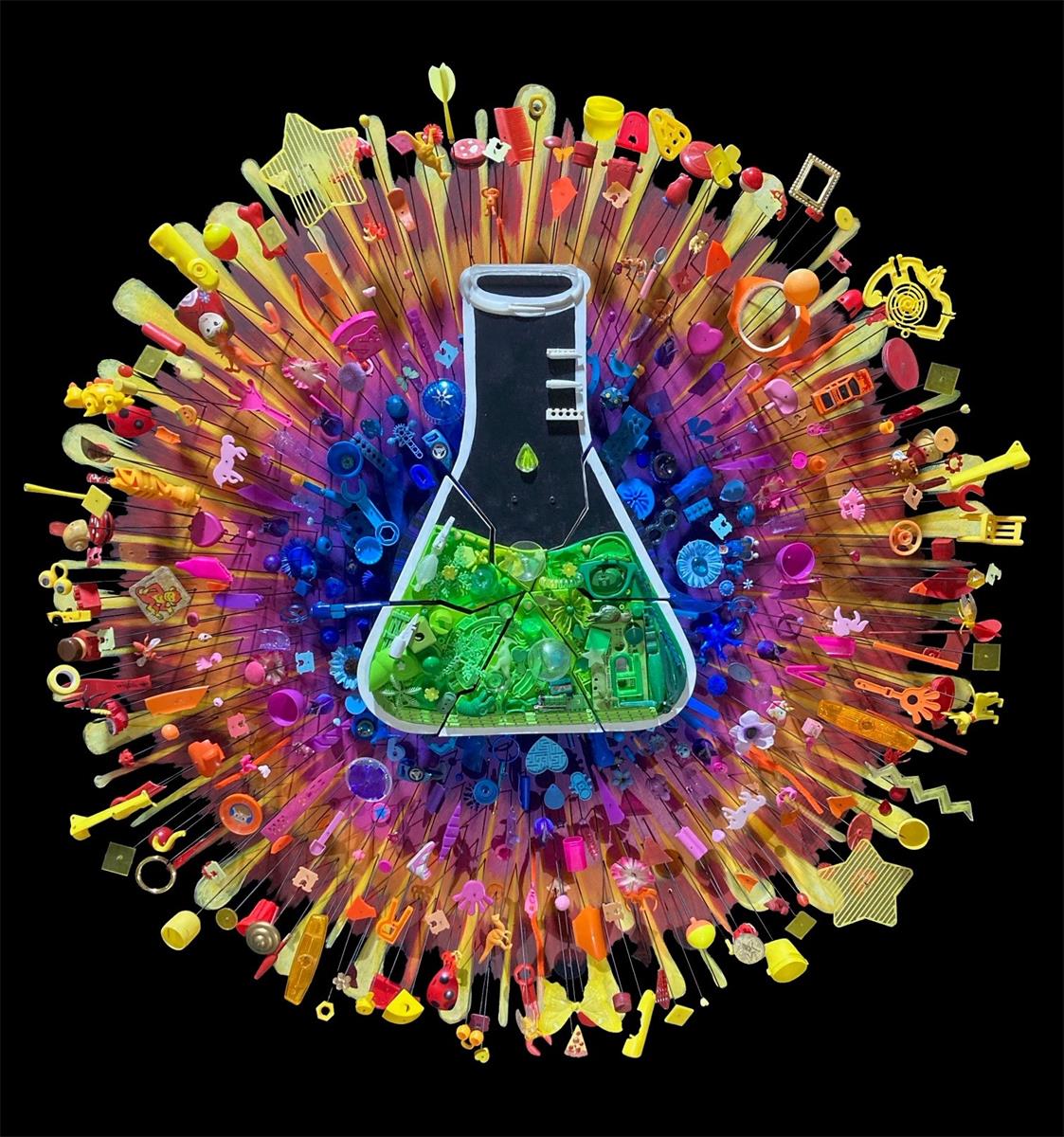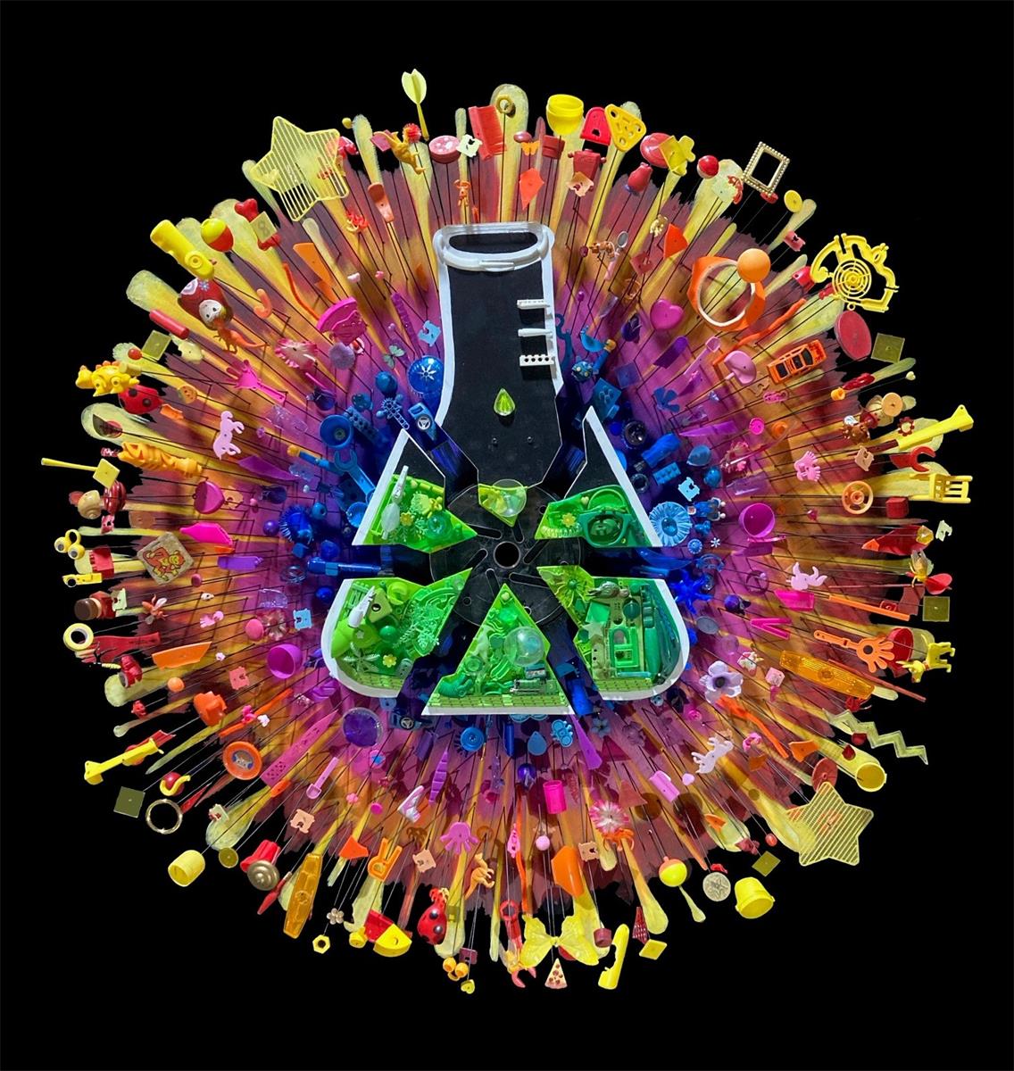 This artwork brings together hundreds of recycled and broken bits and pieces to help define our own cosmic explosion, as one drop too many drips into the universal flask.”