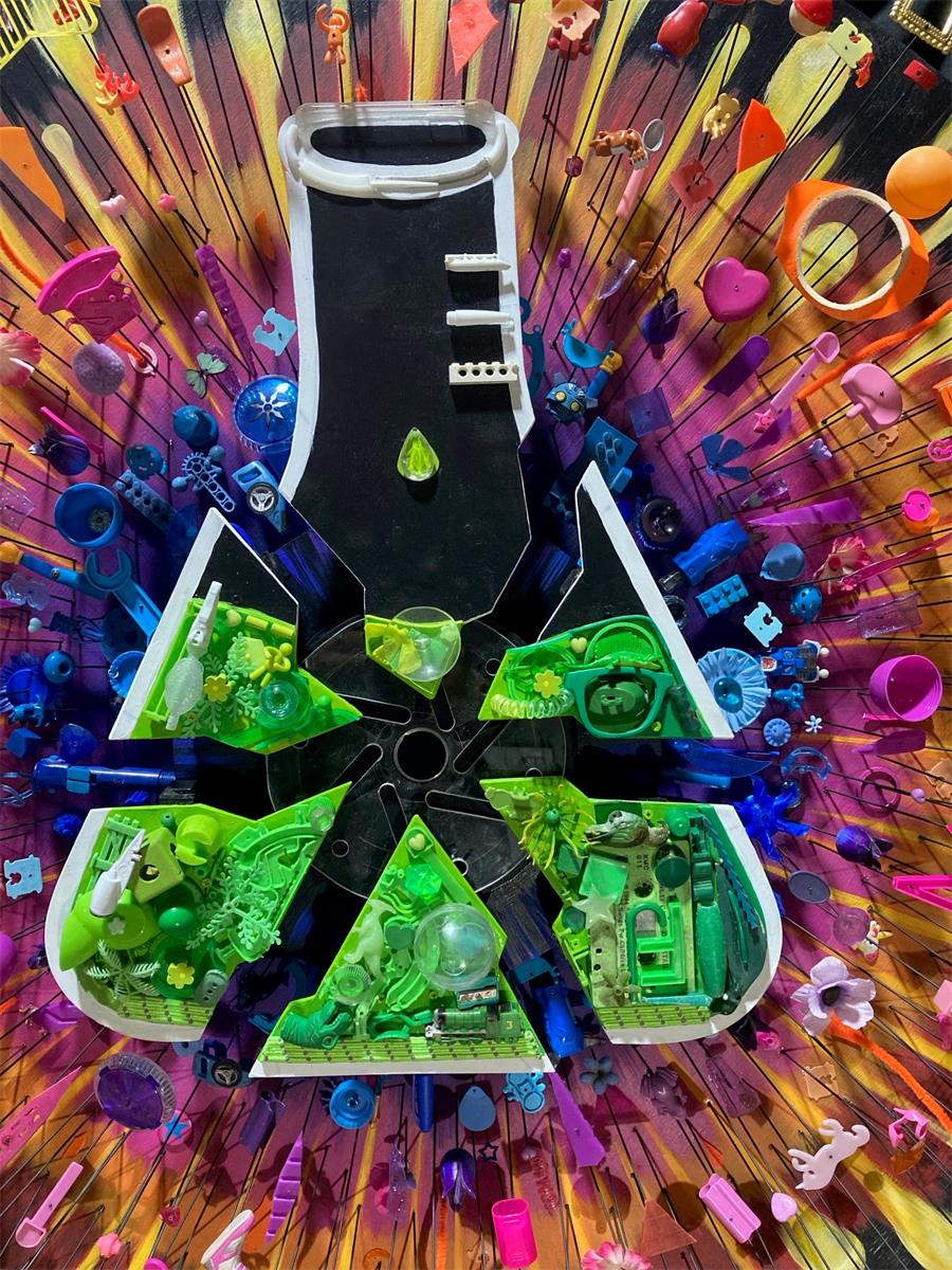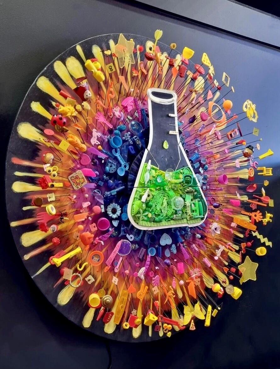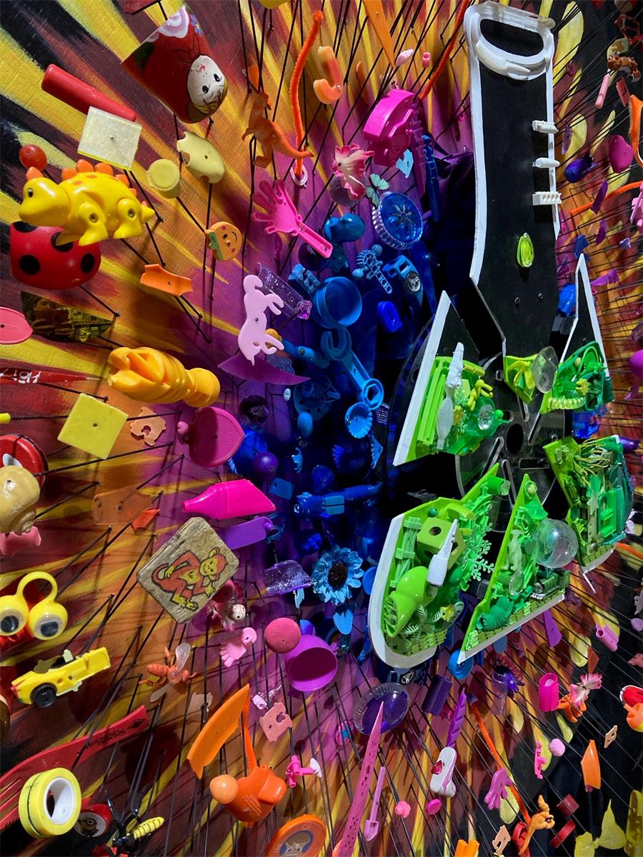 This artwork brings together hundreds of recycled and broken bits and pieces to help define our own cosmic explosion, as one drop too many drips into the universal flask.”