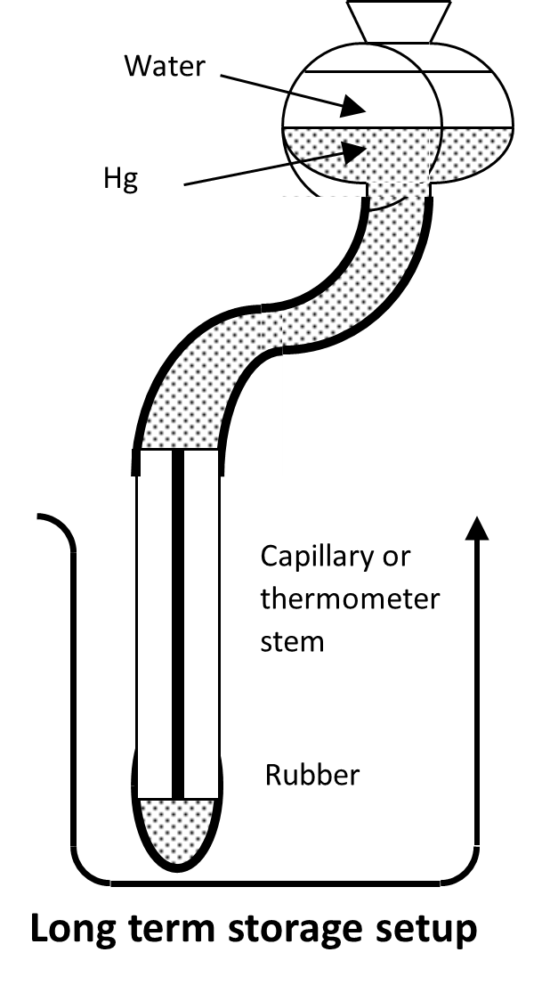 Each student did this experiment only once each year and the infrequent use presented major reliability problems that were solved in most rewarding way. Ensuring the apparatus worked well and avoid frustrations was important for effective teaching of students. Infrequent use would waste mercury between use if left set up, however dismantling to keep all parts clean enough proved very time consuming (even toxic if not careful) and really not always reliable. Lowering the leveling bowl to stop flow allowed air to diffuse through the connecting tubing and oxidised some of the mercury which then clogged the capillary on the next use. Cleaning a clogged capillary proved almost impossible. They were slow to reorder and too costly for a CAE. Fortunately, we found that a broken thermometer (then only about $5 each) was a suitable replacement capillary and when a rubber Pasteur pipette cap was placed over the end of the capillary immediately after each use, this avoided mercury loss and we could leave the whole unit set up under positive pressure from one year to the next, ready for ongoing trouble-free use.
