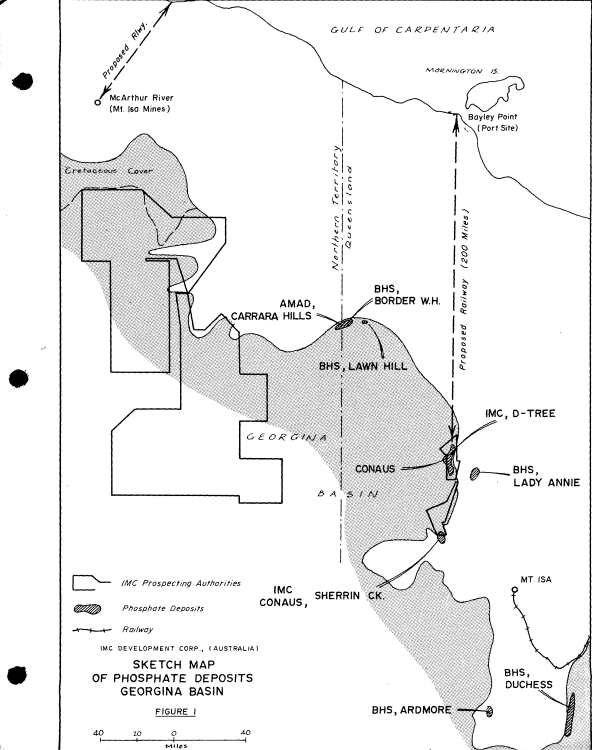 Sketch map of phosphate deposits Georgina Basin (Mataich P., 1969)